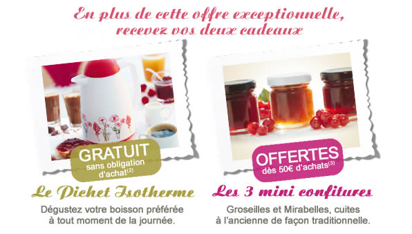 (3) Pour toute commande de 50€ ou plus, un lot de 3 mini-pots de confitures (2 pots aux Groseilles et 1 pot aux Mirabelles) sera joint à votre colis. Contenance 42g. En cas d'indisponibilité, vous recevrez un cadeau