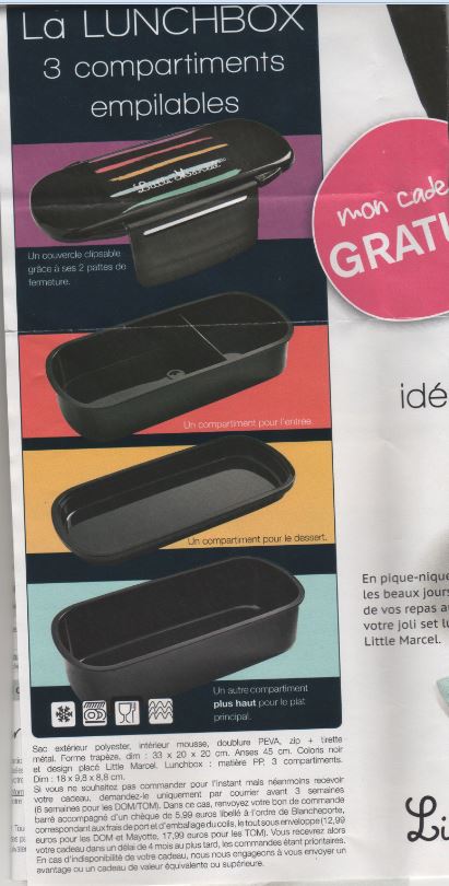 Reçu ce jour le catalogue automne/hiver 2019 avec pour cadeau un set lunch box Little Marcel composé de :