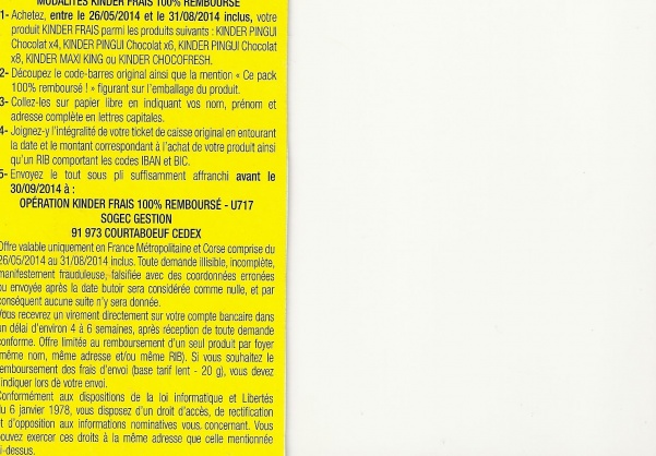 Du 26/052014 au 31/08/2014 les kinder pingoui par 4, 6, 8, les kinder maxi king et les kinder chocofresh sont 100% rembousé.
