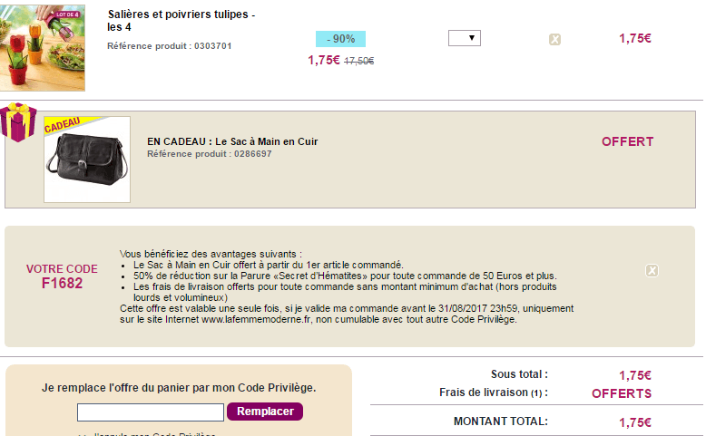 La femme moderne propose des articles soldés à moins de 5€ : deux codes F1682 et F1684