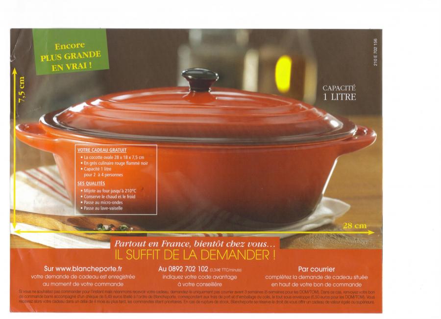 qui donne droit a une cocotte ovale en gres de couleur rouge flammé noir, dimensions : 28x18x7,5 cm pour 2 a 4 personnes (1 litre), mijote au four jusqu'a 210 °,