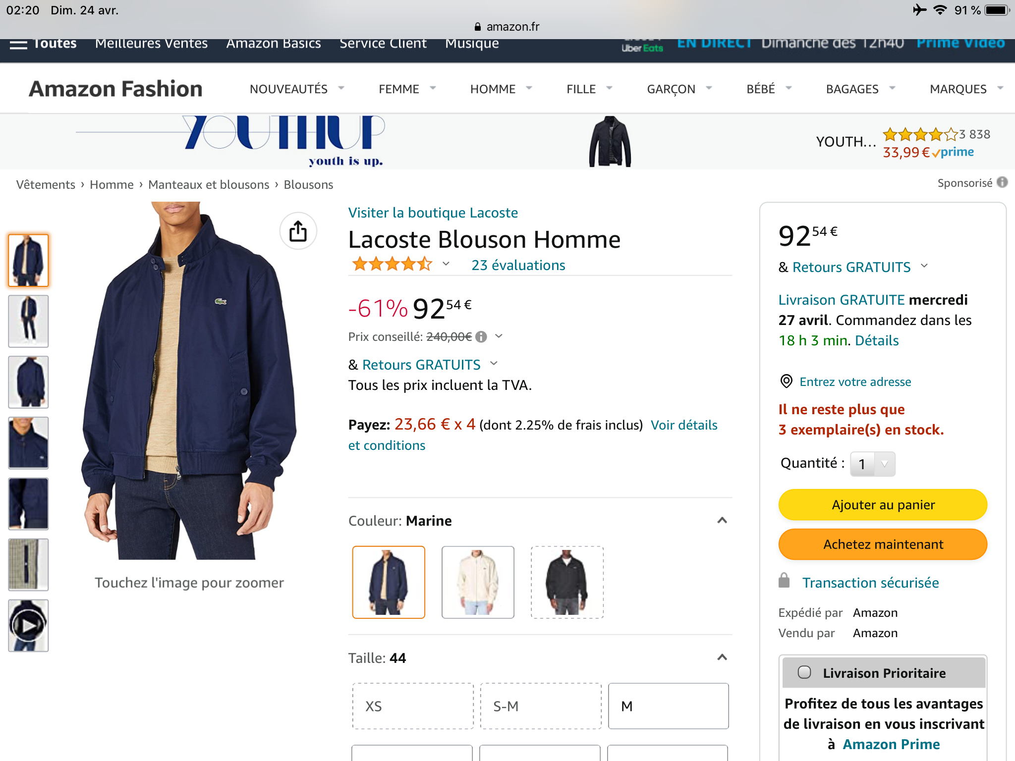 deal Lacoste Blouson couleur Marine Homme taille 44 à 92,54€