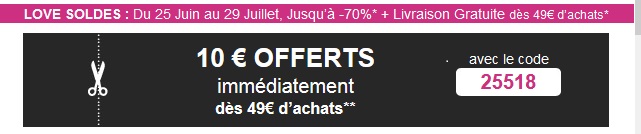 * Offre valable du Mercredi 25 juin 2014 au Mardi 29 juillet 2014 dans la limite des stocks disponibles sur une sélection d'articles porteurs du stickers « SOLDES » de la collection printemps-été du site laredoute.fr. Offre non cumulable avec une autre opération. Livraison gratuite dès 49€ d'achat en relais colis, voir conditions sur le site. ** Le bon d’achat de 10€ à partir de 49€ d’achat est valable immédiatement suite à une création de compte. Offre immédiate et limitée à une seule utilisation par numéro de client jusqu’au 30/06/2014, sur les articles vendus et expédiés par la Redoute (sauf Market Place et Ventes privées), avec le code nope 25518. Réduction valable sur laredoute.fr dans toutes les collections Printemps Eté 2014 (sauf électroménager et jardin). Non valable sur les Aubaines, les prix rouges et les soldes.