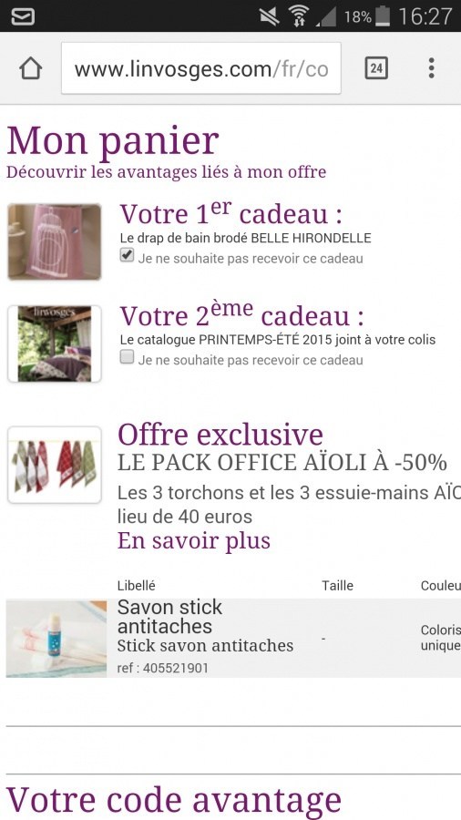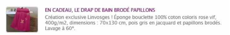 flowergirl123 a dit: Le drap de bain belles hirondelles offert Code 75010 fdp gratuit Linge de maison: lit (drap, parure), salle de bain, table - Linvosges Cliquez pour agrandir... Merci pour le code MAIS IL FAUT NOTER FDP 0 DES 10€ ACHATS