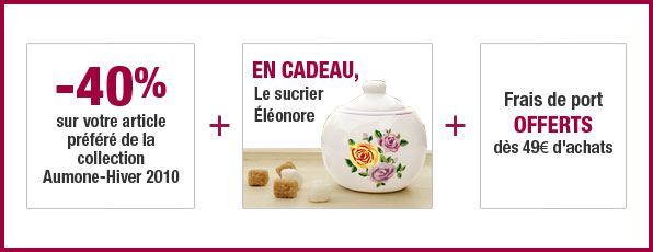 Vous avez - 40% sur votre article préféré automne hiver + en cadeau le sucrier Eléonore + frais de port offert dés 49 euros d'achat.