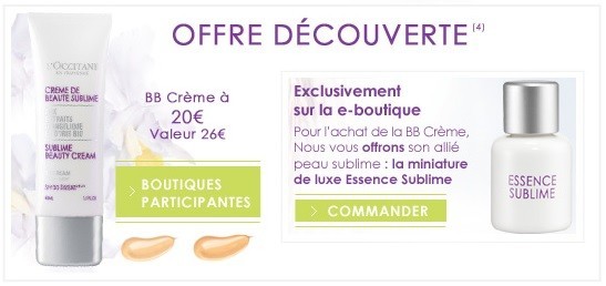 valable une seule fois par personne du 29/05/2013 au 26/06/2013 inclus dans la limite des stocks disponibles. Offre valable exclusivement sur la e-boutique : pour l’achat d’une BB cream à prix découverte, la miniature de luxe Sérum Essence Sublime 7 ml est offerte.