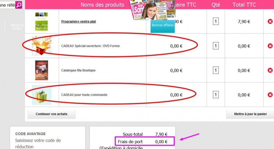 J'ai simulé une commande avec un livre sur Ma Boutique Top Santé et il semblerait que les frais de port soient sans mini d'achat + en cadeau un DVD Forme + un cadeau surprise.Pas mal non? bon je n'ai pas vraiment regardé ce qu'il y avait sur ce site ... Mais à voir !