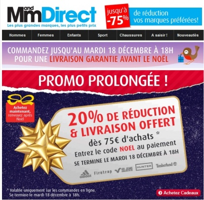 Mandmdirect 20% de réduction & livraison offerte dès 75€ d’achats livraison garantie avant le Noël ! Jusqu'au 18/12 Code NOEL Lien http://www.mandmdirect.fr/default.aspx?a=resetsearch