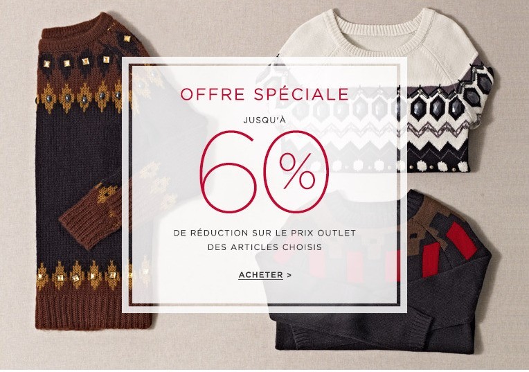 Je viens de recevoir un mail qui m'informe qu'il y a jusqu'à -60% de réduction sur les prix OUTLET, donc les prix déjà remisés !!! Cool, non? je n'ai pas encore regardé, je voulais vous faire part de l'info avant toute chose
