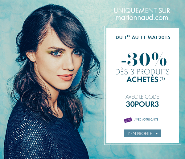 (1) Offre valable du 01/05/2015 au 11/05/2015 inclus uniquement sur Marionnaud, réservée aux porteurs des cartes de fidélité Marionnaud ou pour toute nouvelle souscription au programme de fidélité Marionnaud. Sur la saisie du code 30POUR3, la remise de -30% s’applique uniquement dès trois produits ajoutés au panier. Offre non cumulable avec d'autres opérations promotionnelles en cours, ni en pourcentage, ni en valeur; non valable sur les produits "points rouge" identifiés en magasin, les produits de parapharmacie, de grande distribution et les coffrets maquillage Marionnaud.