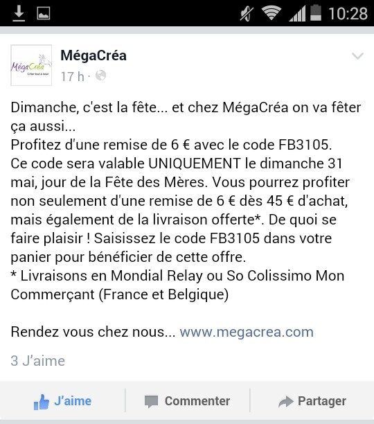 Ce code sera valable UNIQUEMENT le dimanche 31 mai, jour de la Fête des Mères. Vous pourrez profiter non seulement d'une remise de 6 € dès 45 € d'achat, mais également de la livraison offerte*. De quoi se faire plaisir ! Saisissez le code FB3105 dans votre panier pour bénéficier de cette offre.