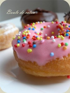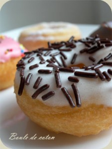 - Tremper les donuts dans le glaçage, saupoudrer de vermicelles ou de perles colorées et laisser prendre à température ambiante