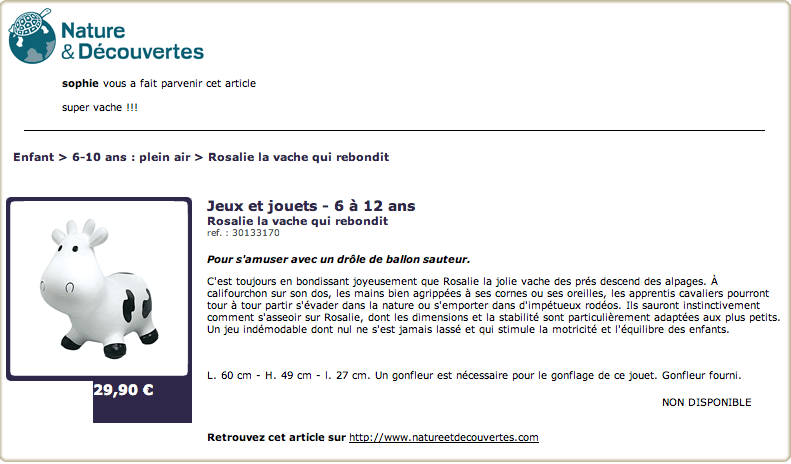 y'a 15 jours lors de notre virée à nantes avec des copines nous avons tourné pendant 1 h sur le périph pour avoir cette fichue vache, éscorté par la gendarmerie (et oui ça c'est une autre histoire, enfin bref) vers 18h30 éreinté de cette journée, nous avons enfin trouvé le magasin nature et découverte et surtout la vache, elle est vraiment superbe, je vous la conseille donc et très solide, du coup les 2 autres copines en on pris aussi une pour décorer la chambre de leurs loulous... quelle histoire cette vache...