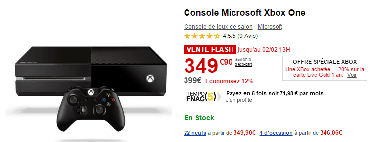 La Fnac a la console de jeux xBox One a 349,90 Euros au lieu du prix normal de 400 €, soit une économie de 50€. La vente flash continue jusqu'au 2 Février ou tant qu'il y a des consoles en stock.