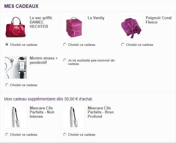 J'ai craqué pour le sac ... mais pour pas cher, 8.45€ :icon_rolleyes: Avec le code CREME en plus offert cette crème Crème Multi-Active Expertise Mains - Soins des mains Sinon y a pas mal d'autres cadeaux sympas, le peignoir il me semble qu'il y était aussi l'année passée, je sais pas si il est bien :?: