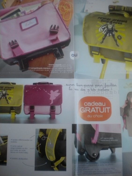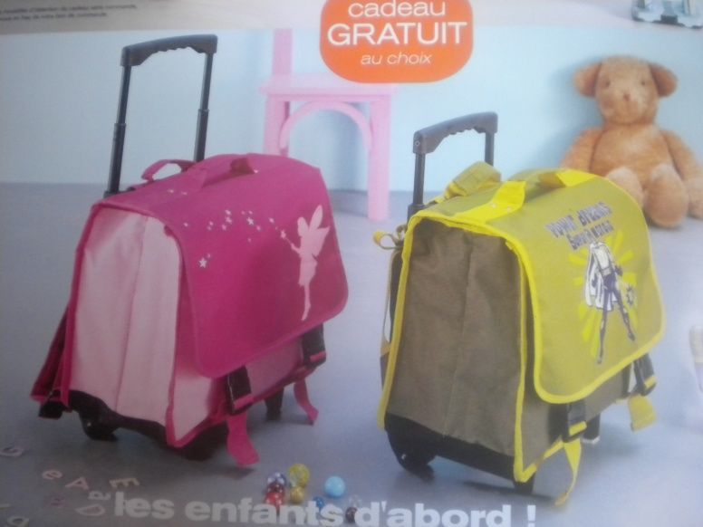 en cadeau : 1 cartable de grand à roulettes, rose avec fee pour les filles, vert avec super heros pour les gars, desolée, pas de photo, mon scanner est decedé.