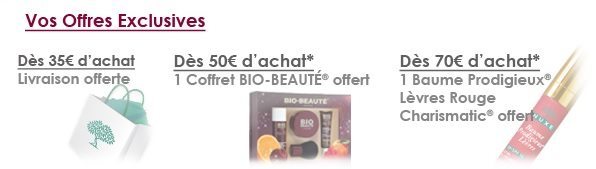 *Un coffret BIO-BEAUTÉ® dès 50€ d’achat et un Baume Prodigieux®Lèvres Rouge Charismatic® offert dès 70€ d’achat (dans la limite des stocks disponibles). Le Laboratoire NUXE se réserve le droit de remplacer ces produits par des produits de valeur équivalente en cas d’indisponibilité.