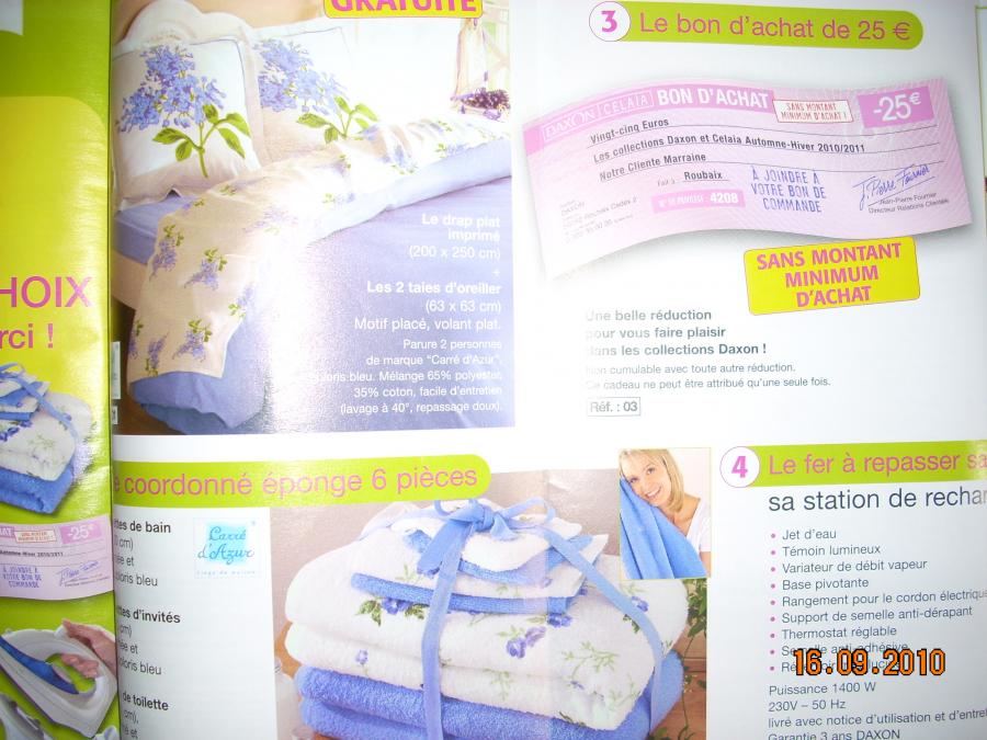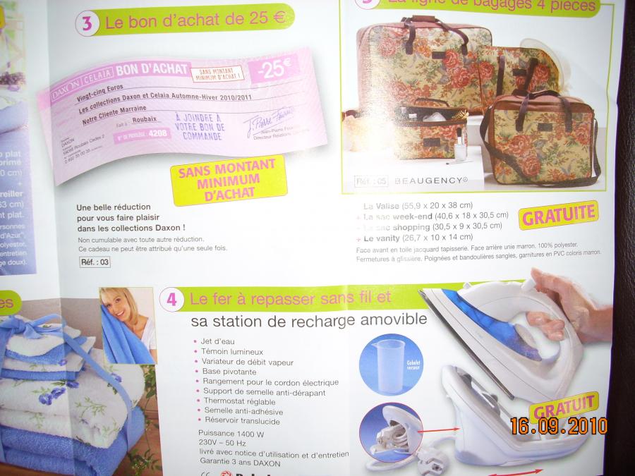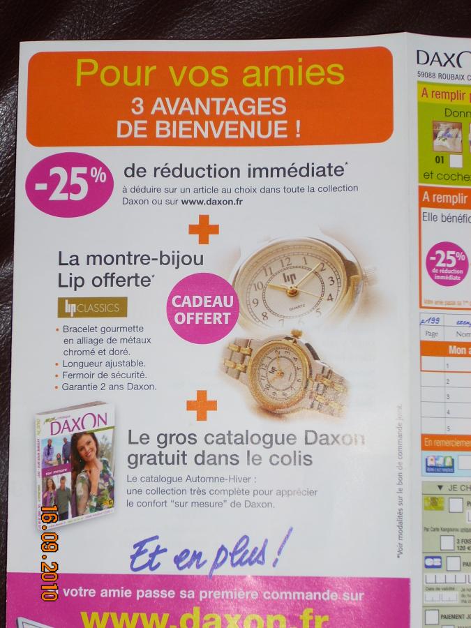 amric Membre actif 30 Janvier 2010 868 2 60 16 Septembre 2010 #1 n privilège 4208 pour vous 5 cadeaux au choix(voir phot)et pour votre amie -25%(sur son premier article)+la montre bijoux LIP(voir photo)+le catalogue+fdpp:cry: Fichiers joints DSCN1851.jpg 85.6 KB · Affichages: 95 DSCN1850.jpg 90 KB · Affichages: 102 DSCN1855.jpg 88.3 KB · Affichages: 103