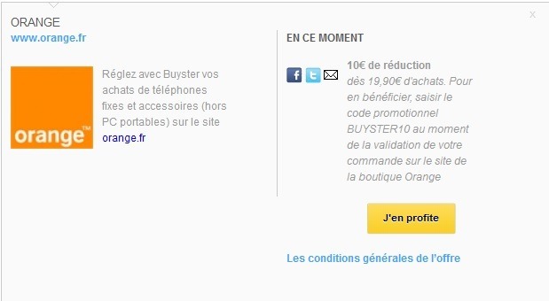 Bénéficiez d'une réduction immédiate de 10,00€ en saisissant le code BUYSTER10 au moment de la validation de votre panier pour tout achat d´un montant minimum de 19,90€ effectué sur des téléphones fixes et des accessoires (hors PC portables) sur le site orange.fr
