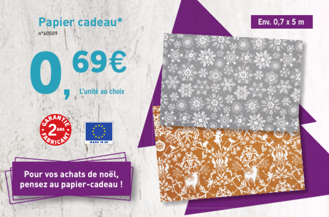 Le rouleau de papier cadeau 0.7 x 5 m à 0.69€ chez Lidl du 26 novembre au 02 decembre.