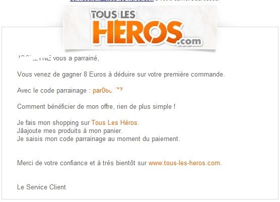 , une fois que vous aurez envoyé par mp vos Nom Prénom et Mail au parrain, vous allez recevoir un mail de tousleshéros.com avec un code de parrainage :