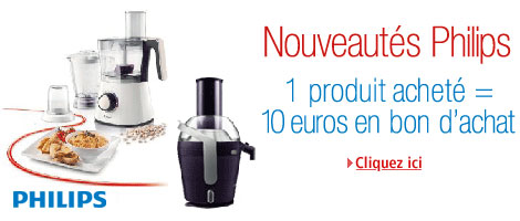 Du 2 au 22 avril 2012 inclus, achetez une nouveauté Philips culinaire et bénéficiez d’un bon de réduction de 10€ à valoir sur votre prochain achat Philips sur toute la boutique Petit électroménager Philips.