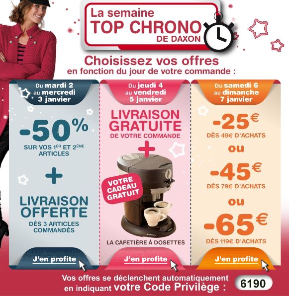 - du 02/01 au 03/01 : -50% sur les 1ers et 2è articles + livraison offerte dès 3 articles commandés