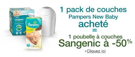 1 poubelle à couches Sangenic à -50% de réduction pour l'achat d'1 pack de couches Pampers New Baby sur Amazon jusqu'au 20 septembre 2014 en indiquant le code promotionnel PROMOPOUBL.