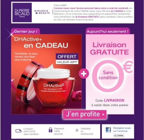 PR crème valeur 50€ offerte et fdp offert aujourd'hui