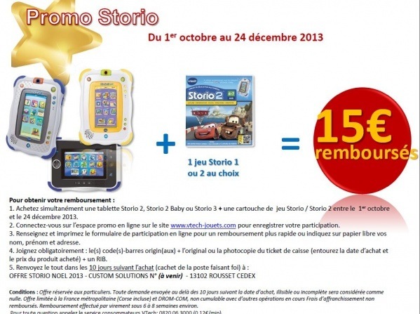 en ce moment 12e sur votre compte waaoh pour l'achat d'une storio 2 (elle reviendrait à 77,25) + ODR de 15e pour l'achat d'une tablette et d'un jeu.