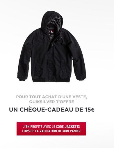 Pour tout achat d'une veste, Quicksilver offre un bon d'achat de 15€ en mentionnant le code promo JACKET13