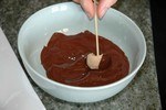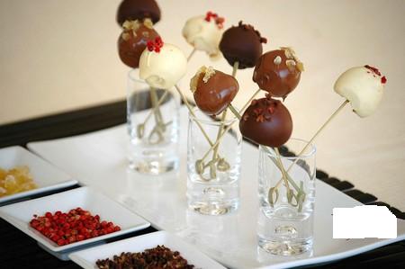 e fondre le chocolat noir dans un saladier, piquer une bille de foie gras sur une mini brochette et l'enrober rapidement dans le chocolat fondu. Disposer quelques grains de poivre de Séchouan sur le dessus et laisser sécher.