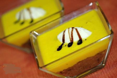 caviar d'aubergine velouté de poivrons jaune , présenté avec sorbet de fromages blanc