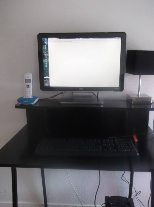 bureau blanc abimé couleur passé il avait quelques années bombé en noir et vernis cette fois ci ;-)(la lampe becquet a 1 euro ^^)