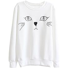 Gleader Coreenne Casual Femme Pull Minou de Dessin Anime Imprime Lache Polaire Chandail Sweat-shirt Col Rond Tops Blanc