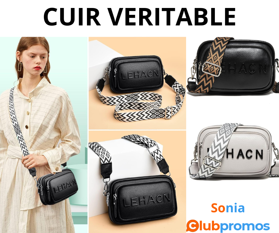 deal Sac Femme Bandoulière cuir véritable large Sangle - 3 coloris -avec 4 Poches Zippées Spacieuses 6,70€ à 7,22€ au lieu de 26,88€ sur Amazon EXPIRE