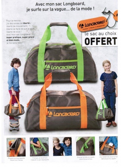 Donc le sac orange est en fait un sac de sport marron avec la poignée orange et inscrit longboard, il n'est pas très grand (1 peu plus petit que la fee clochette)