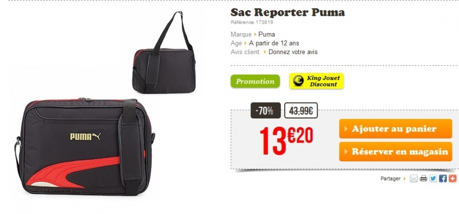 J'ai pensé que cette offre pourrait vous intéresser : un sac reporter de marque PUMA qui bénéficie d'une réduction de - 70 % soit 13.99€ au lieu de 43.99€.