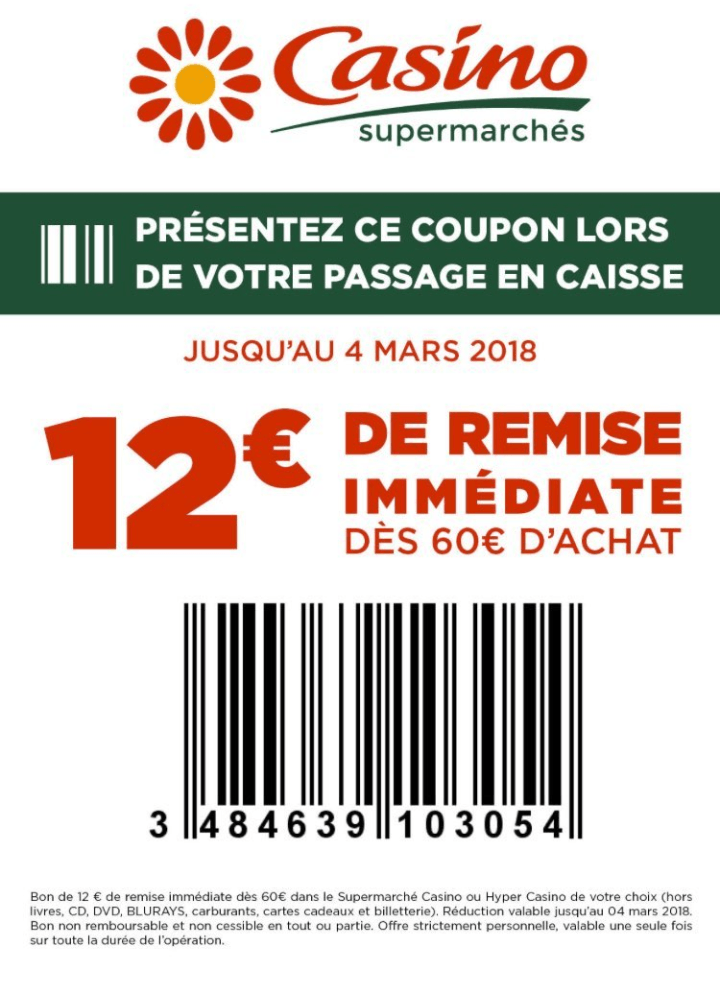 -50% offerts en bon d’achat sur toute la cuisson, accessoires de cuisine et de cuisson. Hors produits en promo « 1+1 gratuit », « 2+2 gratuits avec la carte » et « -50% sur 1 produit ». Bon utilisable sur tout le magasin (hors livres, cd, dvd, blu-ray, carburants, cartes cadeaux et billetterie). Bon non cessible et non remboursable en tout ou partie. Offre non Cumulable avec les offres gros volumes marque casino et hors offre coupon de l’application casino max. Retour valable dans tous les supermarchés Casino