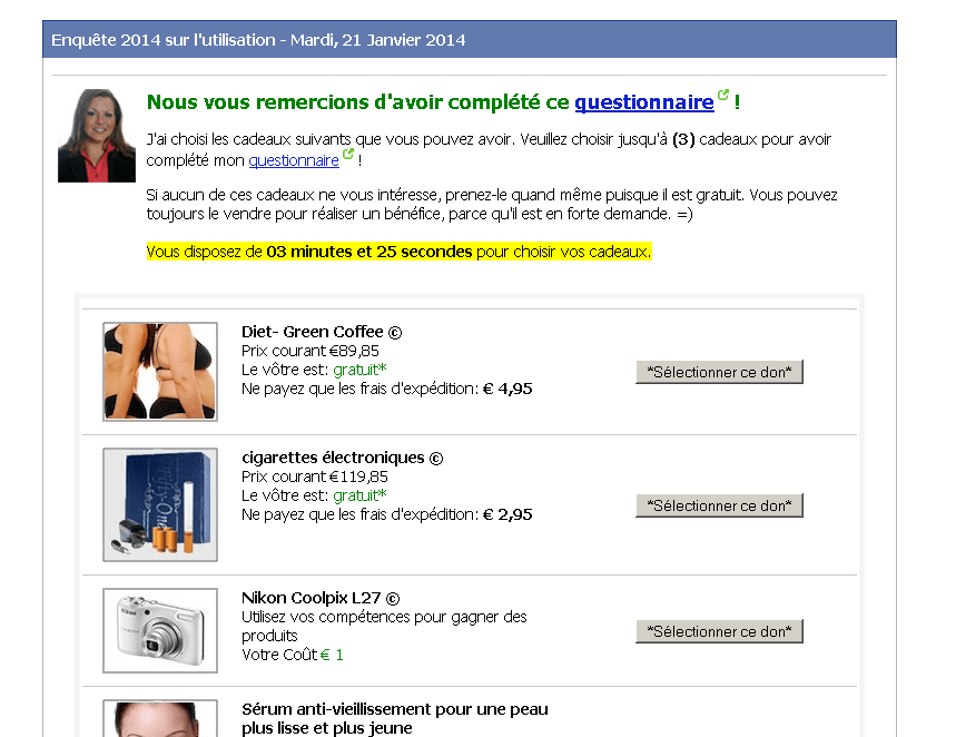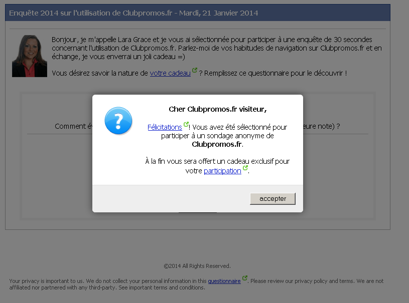 En me connectant sur clubpromo et en utilisant firefox une page pour repondre à un questionnaire sur clubpromo s'est ouverte, c'est une arnaque