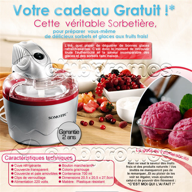 Si vous ne souhaitez pas commander aujourd'hui, vous pouvez recevoir votre sorbetière en réglant la participation forfaitaire aux frais de mise à disposition à domicile, en imprimant la page cadeau et en la joignant à un chèque de 5,50euros à envoyer à AFIBEL - 59677 ROUBAIX CEDEX 2. En cas d'indisponibilité, Afibel remplacera ce cadeau par un cadeau d'une valeur égale ou supérieure.
