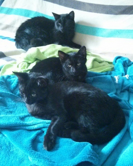 mes trois bébés réunis, j'avais déjà mis la photo une fois je pense, ils restent "entre chats noirs" et souvent ce dernier temps avec le temps froid qui arrive, ils font une seule "boule noire", sans qu'on voie ni la tête ni les pattes tellement ils sont entrelacés coeurturn