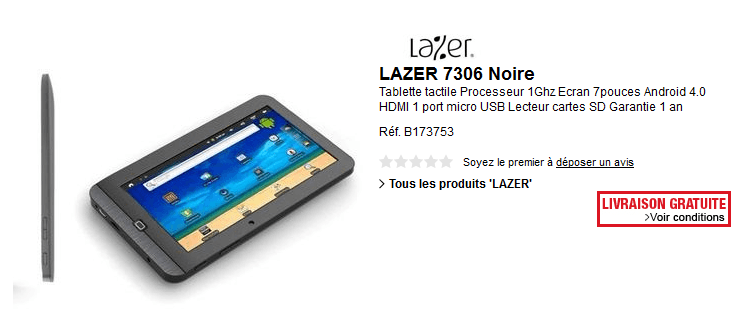 Tablette LAZER 7306 7" android 4.0 à 69€ et livraison gratuite