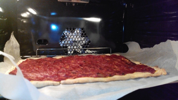 Allumer le four à th. 180 ou th.6, étendre la pâte au rouleau assez finement sur du papier cuisson, puis napper avec la sauce. Enfourner pour 20 mn, la tarte est prête quand les bords sont bien dorés.