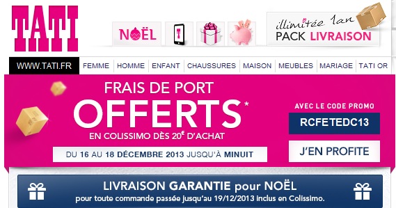 Offre "Livraison offerte en colissimo" valable sur le site tati.fr du 16 au 18 décembre 2013 jusqu'à minuit pour toute commande d'un montant minimum de 20€ (hors frais de port) avec une livraison en Colissimo uniquement.