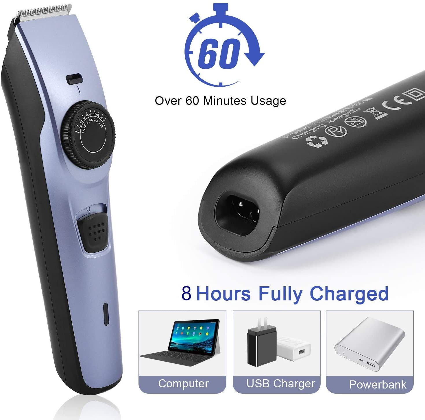 • 【Charge rapide et longue durée】 Cette tondeuse à cheveux sans fil est équipée d'un cordon d'alimentation USB, qui peut être chargé avec une tension de sortie de 5 V, un adaptateur USB ou une interface USB pour ordinateur. Il faut environ 2 à 3 heures pour que ce produit soit complètement chargé. Lorsqu'il est complètement chargé, le produit peut fonctionner pendant plus de 60 minutes d'utilisation continue sans alimentation.