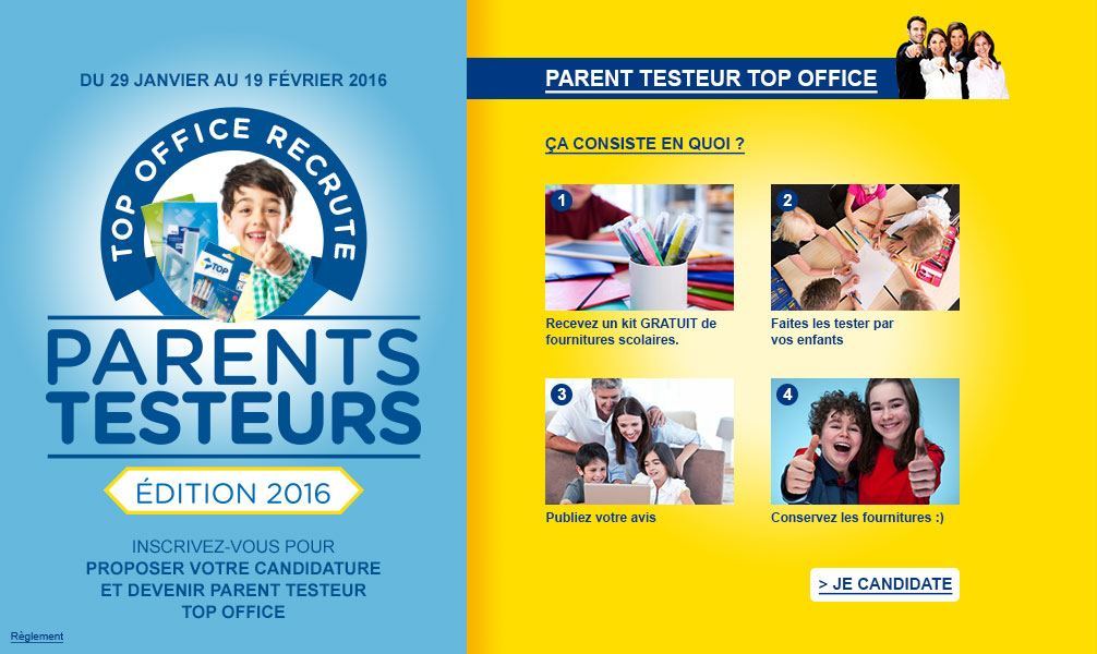 Leur mission : faire tester les fournitures scolaires Top Office par leurs enfants, puis exprimer leur avis sur ces produits via ce site.