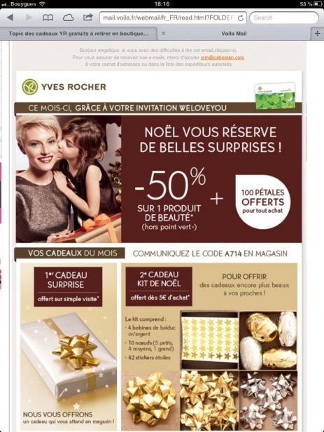 Merci! Utilisé aujourd'hui dans la petite boutique de Nanterre... la jeune vendeuse a eu un peu de mal, mais au final, j'ai bien eu le mini gel douche, -50% sur un soin visage et -40% sur l'huile sèche nutrition... Bon long week-end!J'ai reçu la même offre avec un mini gel douche offert avec le code 3626![]()
