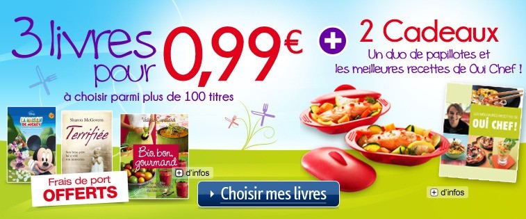 Lien : Nouvelle offre France Loisirs : 3 livres pour 0.99€ à choisir parmi plus de 100 titres + 2 cadeaux : un duo de papillotes et les meilleures recettes de Oui Chef.