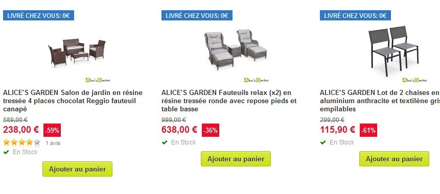 En vente privée sur Pixamania : Alice Garden, il y a des salons de jardin, des trampolines, bains de soleil etc et apparemment c'est livré pour 0€ chez vous...